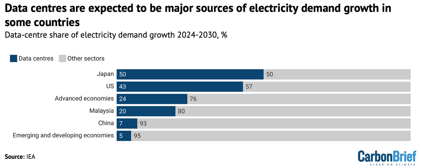 The below image shows how data centres are expected to contribute to electricity demand growth in major countries: